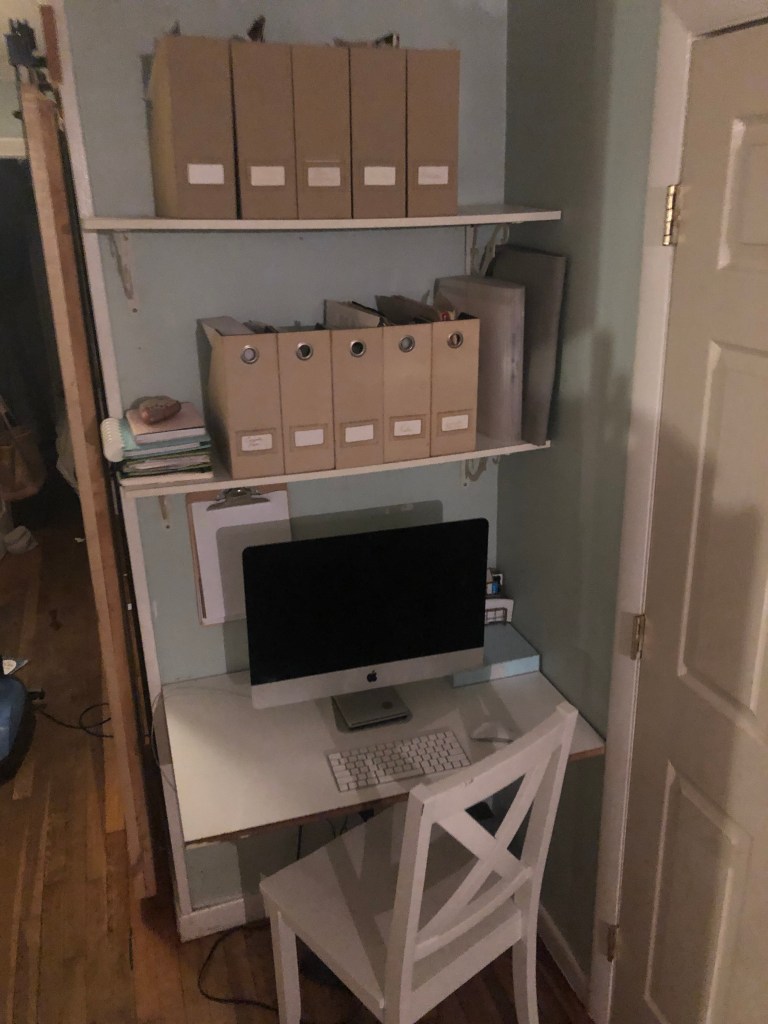 We run two small businesses and homeschool in this tiny house so a functional office space is crucial. Or…maybe just a hole or niche in the wall, because thats all we have to get these jobs done. Between our kitchen and dining room was a free and seemingly awkward corner that we converted with some shelves and brackets. Keeping the space visually simple was a challenge but I’m trying to streamline it with linen magazine files to hold the paper clutter.