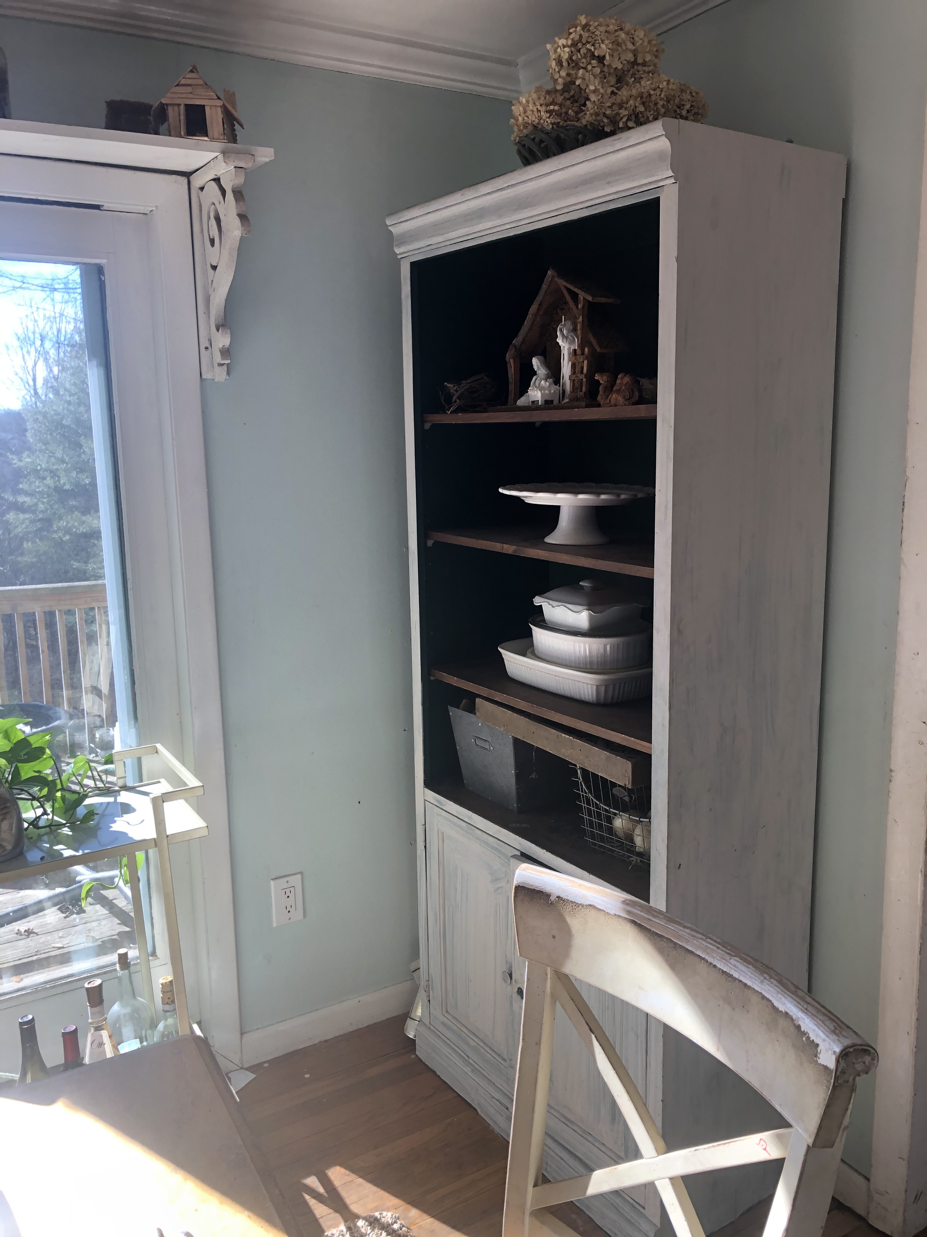 These two dining bookshelves hold a lot of our homeschool supplies in the bottom halves and easily help turn the dining room into a great work space allowing us to free it up and put everything away locally when the dining room needs to be a dining room again.