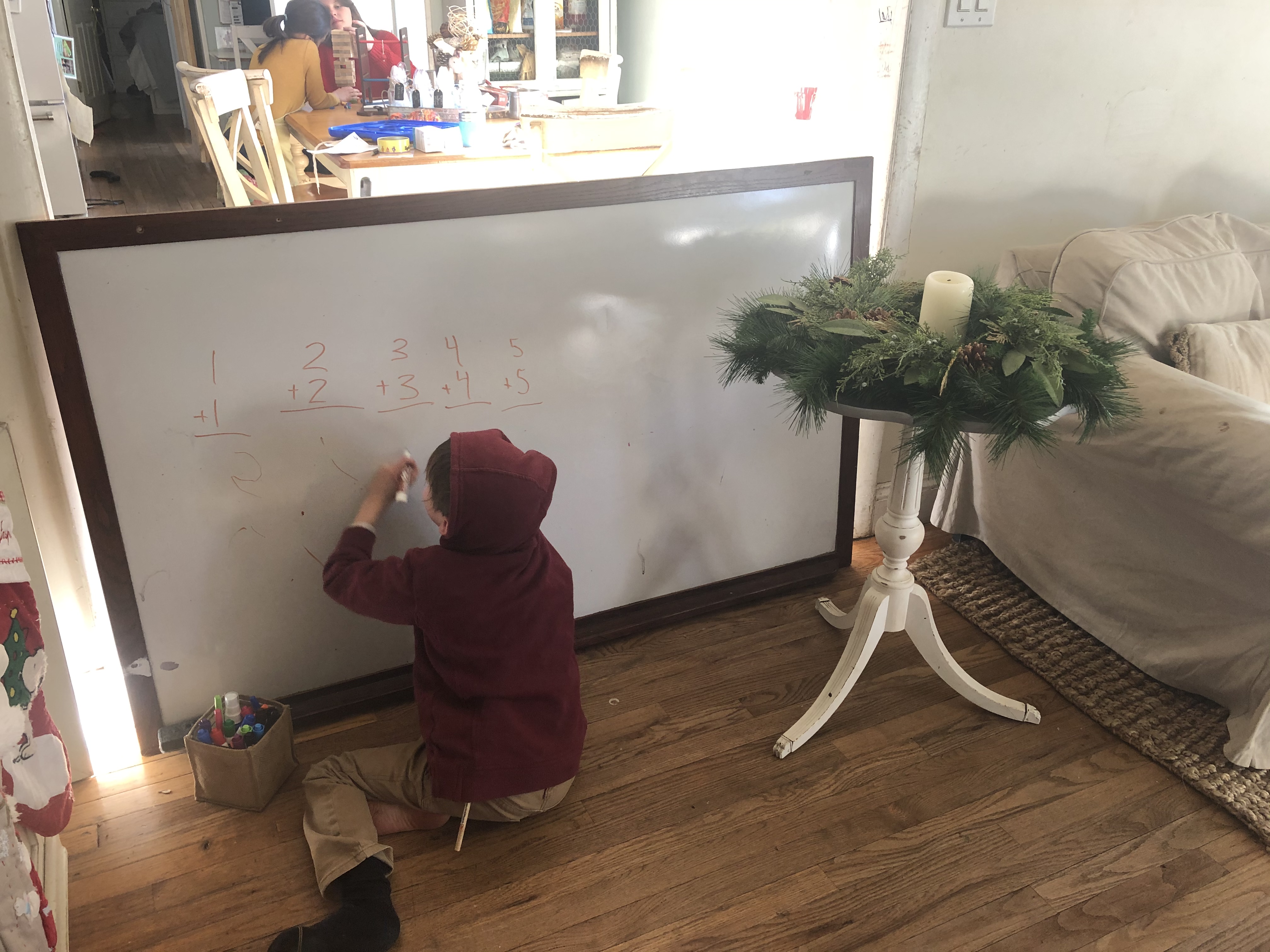 I keep a large white board tucked away behind one of my living room couches vs hanging it on the wall so I can easily pull it out for regularly use and then put it away when not needed. Math practice or guided lecture with note taking is what I typically use the big white board for but I also keep little magnetic white boards on my fridge for demos in the dining room which is right across from the kitchen. Super easy when I’m making lunch and kids at the dining table ask a question or need me to demo a math problem. I have even used my white fridge and dry erase markers as a white board when larger space is needed. A Norwex magic eraser cleaning pad easily removes markings.