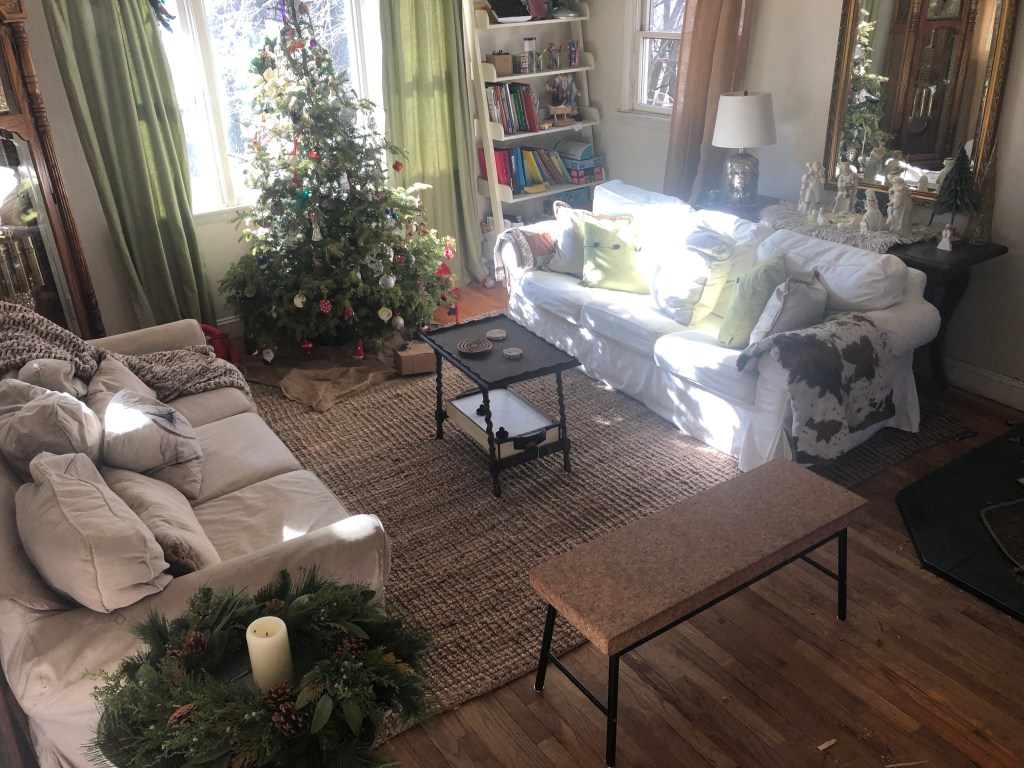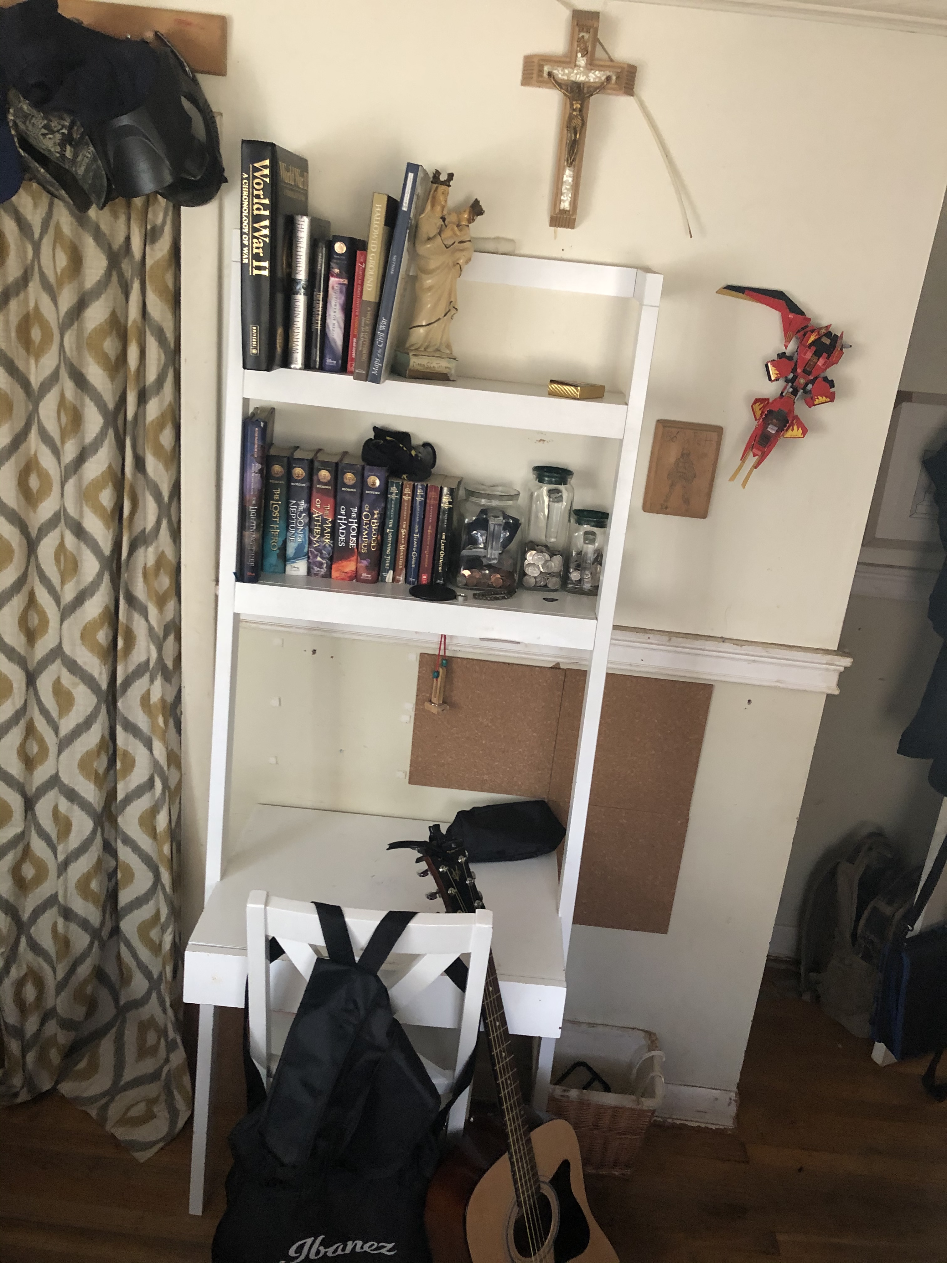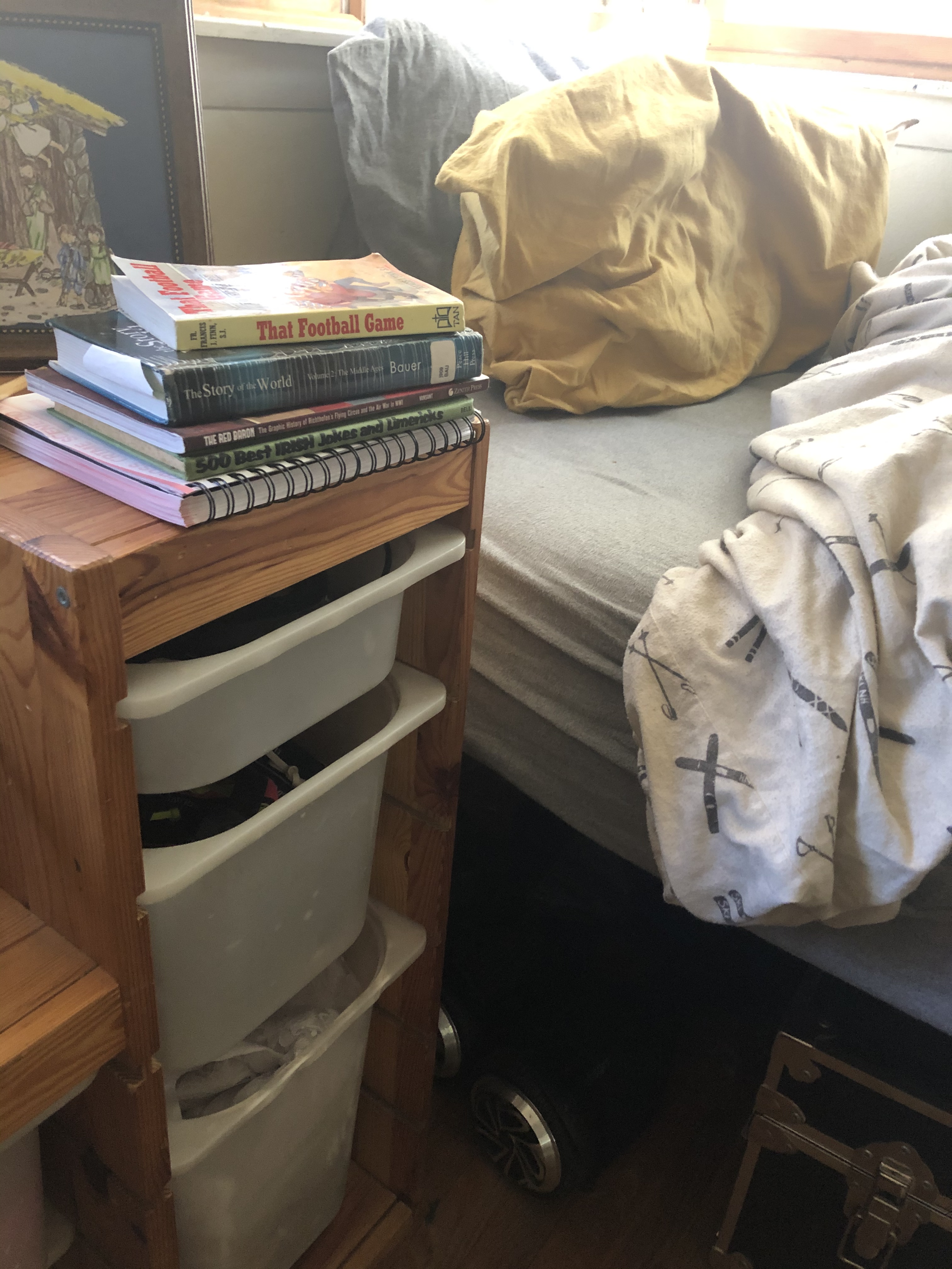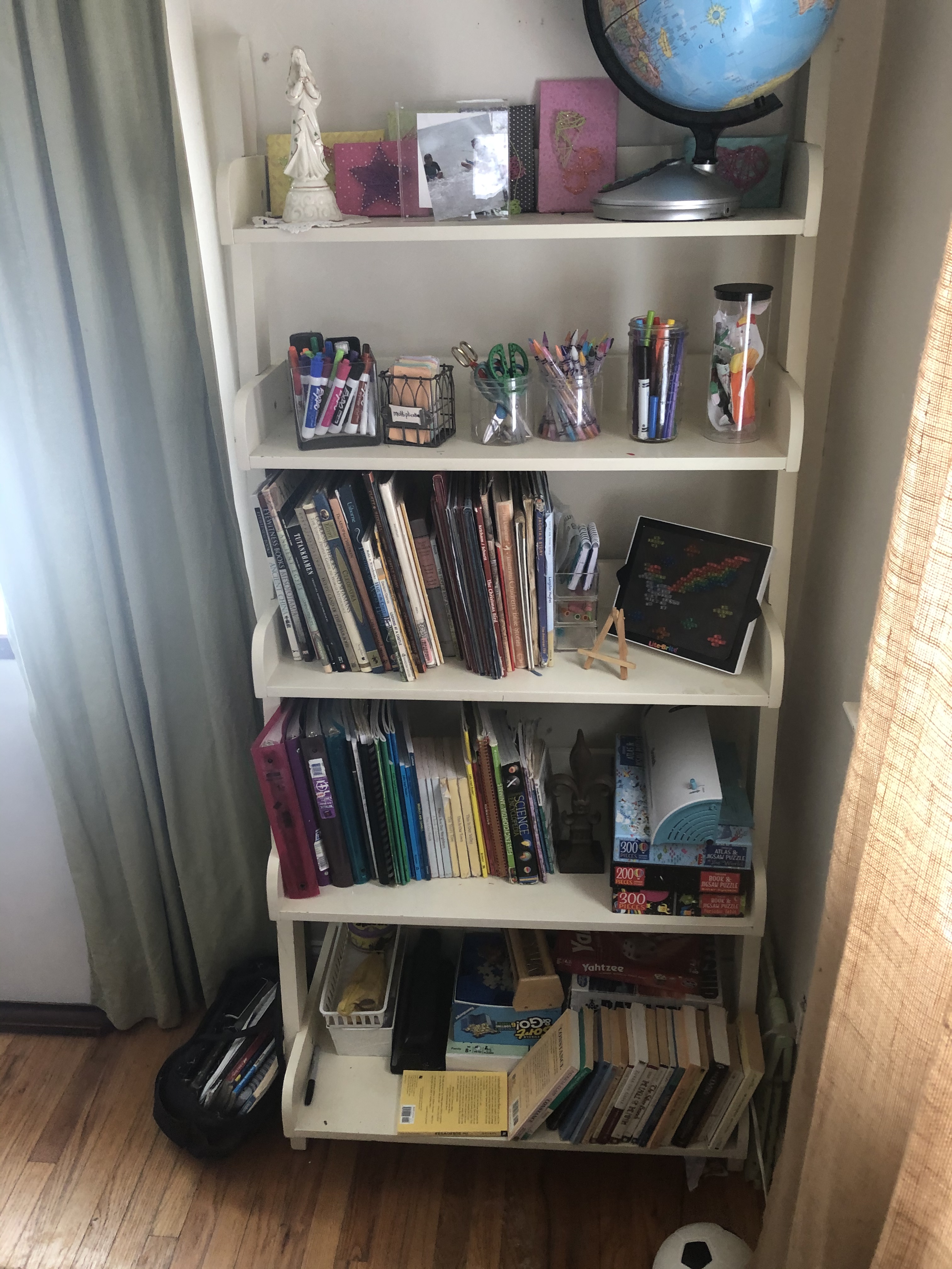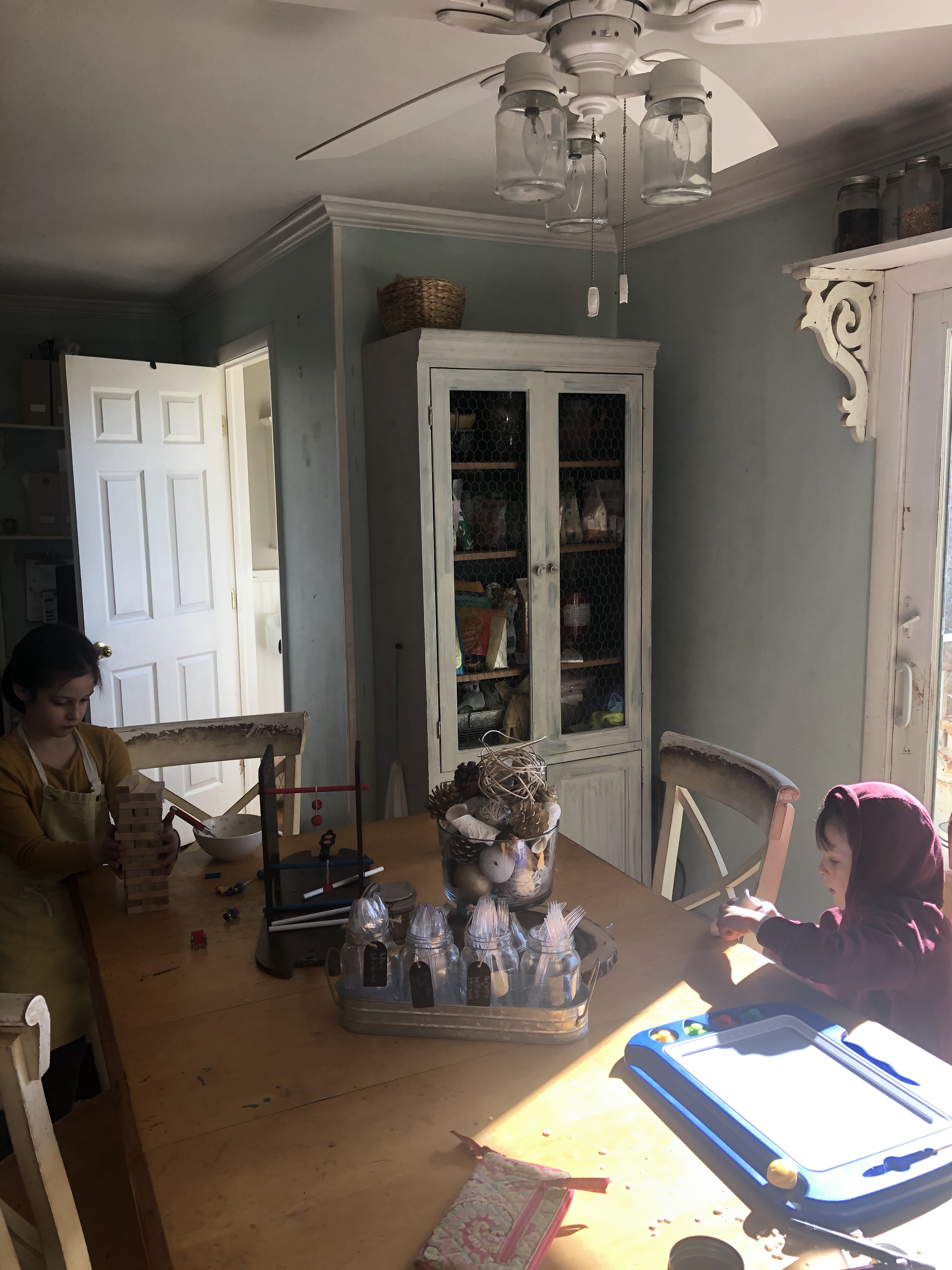 Large work surfaces are essential but they are also obstructive to traffic in a small house. Another reason why dining tables are so commonly occupied by homeschooling. But it’s not enough when your homeschooling SIX. I like to break up middle school and elementary school into Living Room and Dining Room so I can easily flow from space to space and be present for both at the same time while keeping their needs separate. I have a “tuck away table desk” to help my living room accommodate a second large work space without having to live with it when I need my living room to just be a living room and not school room.