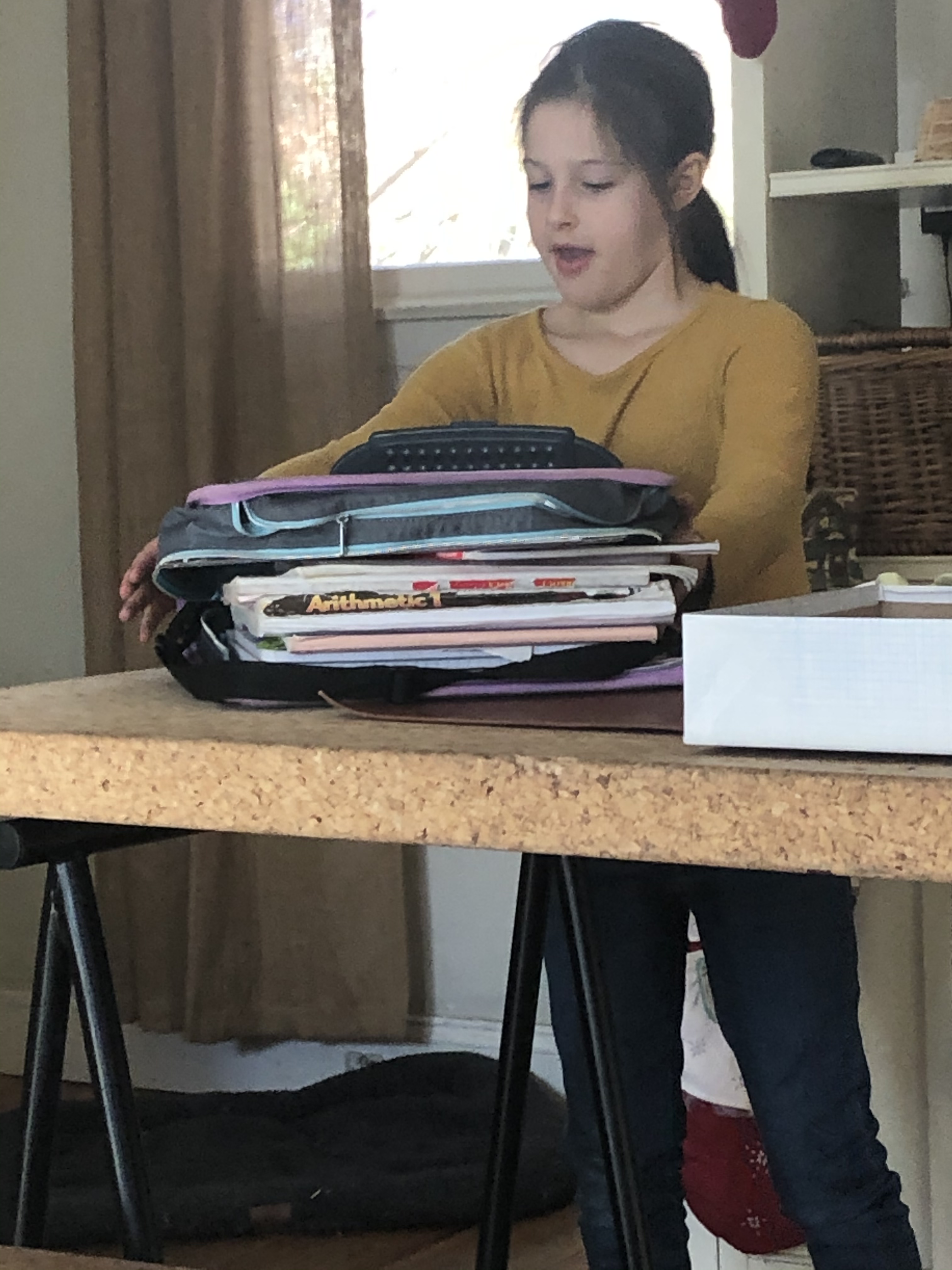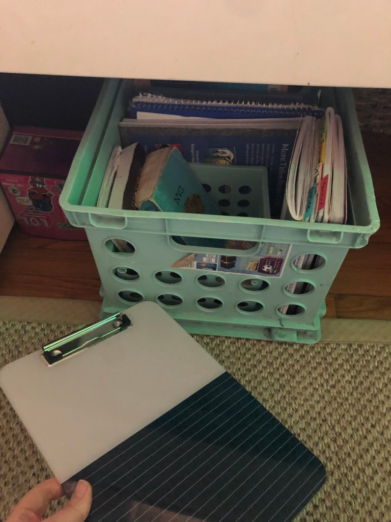 Wether you want to cozy up on the couch or work while riding in the car, clip boards enable writing anywhere and a crate with each of your kids main course texts allow them to spend a week with grandma or do a day at the library and get a change of scenery or even just move around the house as they see fit. Not being confined to a single space is really important for us. I like to think of the kids as free to fly only with a responsibility that must go wherever you go.