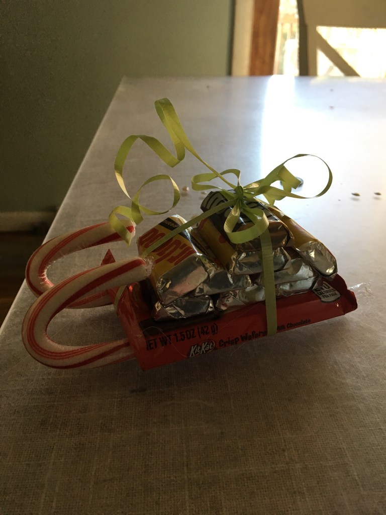This candy santa sleigh I actually spent a little loot on. It doubled as an ornament though and I’ve never seen the kids get so excited hot gluing this craft together.