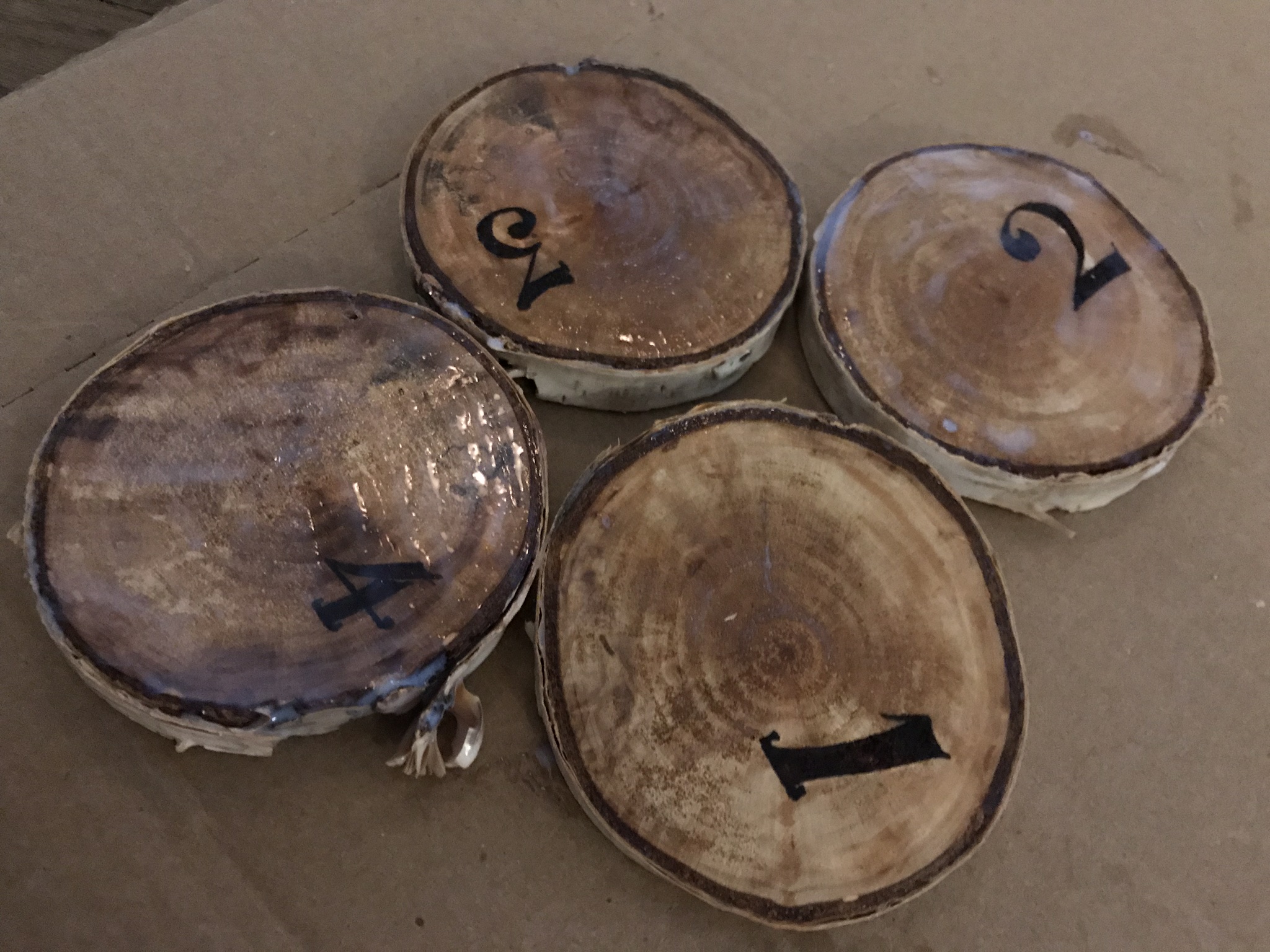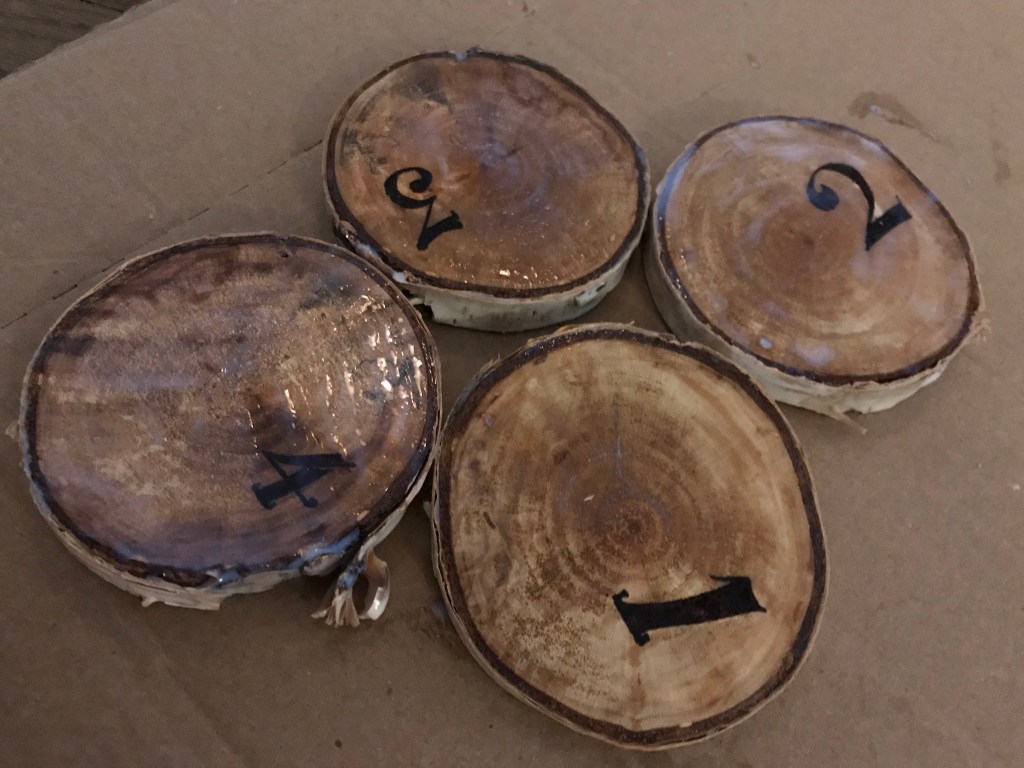 Josh cut these birch boughs he found at work into 1/2 cm thick rings for me. We got over 50 coasters out of a few branches, which I used a wood burning tool from Walmart to etch numbers in a font I enjoy, then decoupaged them for a nice finish. Hot glue a circular piece of felt to the bottom for no scratch setting. 50 coasters cost about $10 in felt, glue sticks and decoupage. However, the wood burning tool was about $20 if you don’t already own one factor that expense as well.