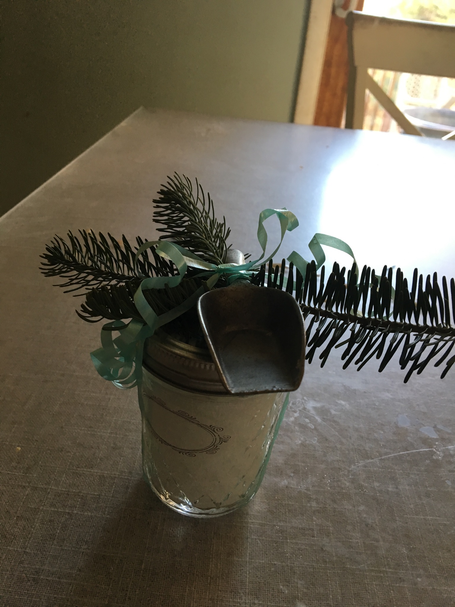 This was about $3 in granulated sugar that I added coconut oil and a few drops of my choice scent of DoTerra essential oil. I used old jelly jars for the craft but I’ve also Thrift store hunted for jars between $0.25-$1.00 when I don’t have them on hand. The scoop was a Dollar Tree find, and I cut pine tree branches for garnish. You could also use fresh herbs lime rosemary or sage. Coconut/Sugar bath bombs are another idea similar to this one that you can have some art fun with food coloring to decorate them too.