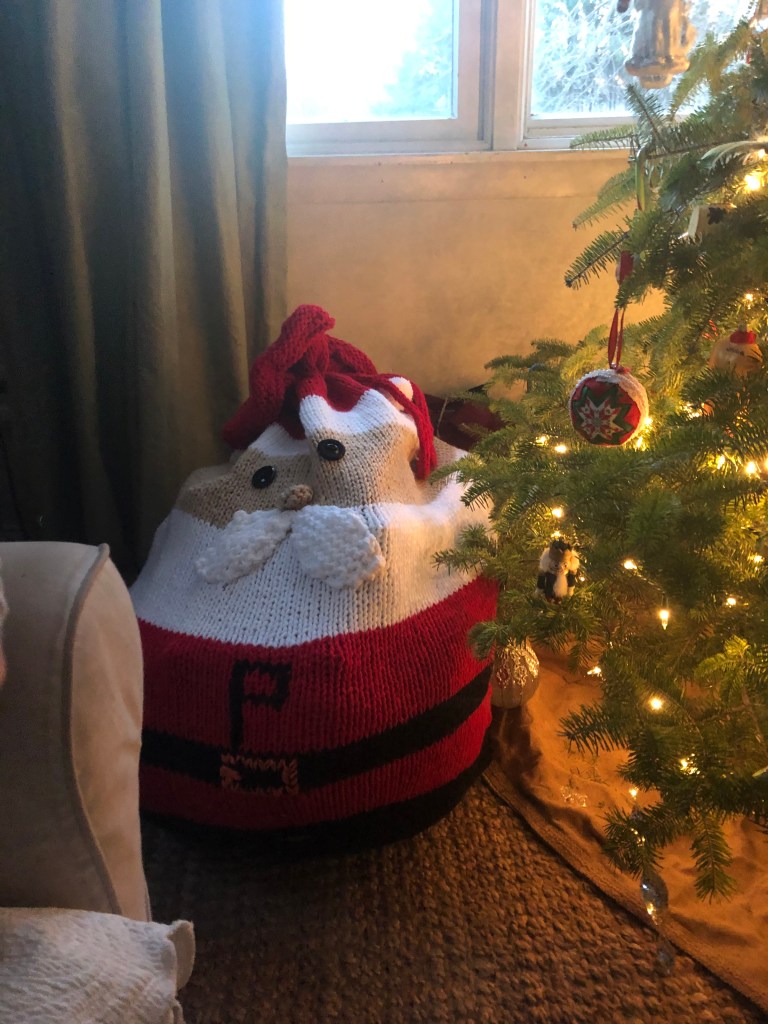 I highly recommend sleigh bags, if you aren’t a wrapper and want to save the moolah or even want to do both like I do, because these hold and hide gifts in between and can easily be carried out to under the tree. My mom knitted one for our family and I have another store bought one for guests that stays under the tree.