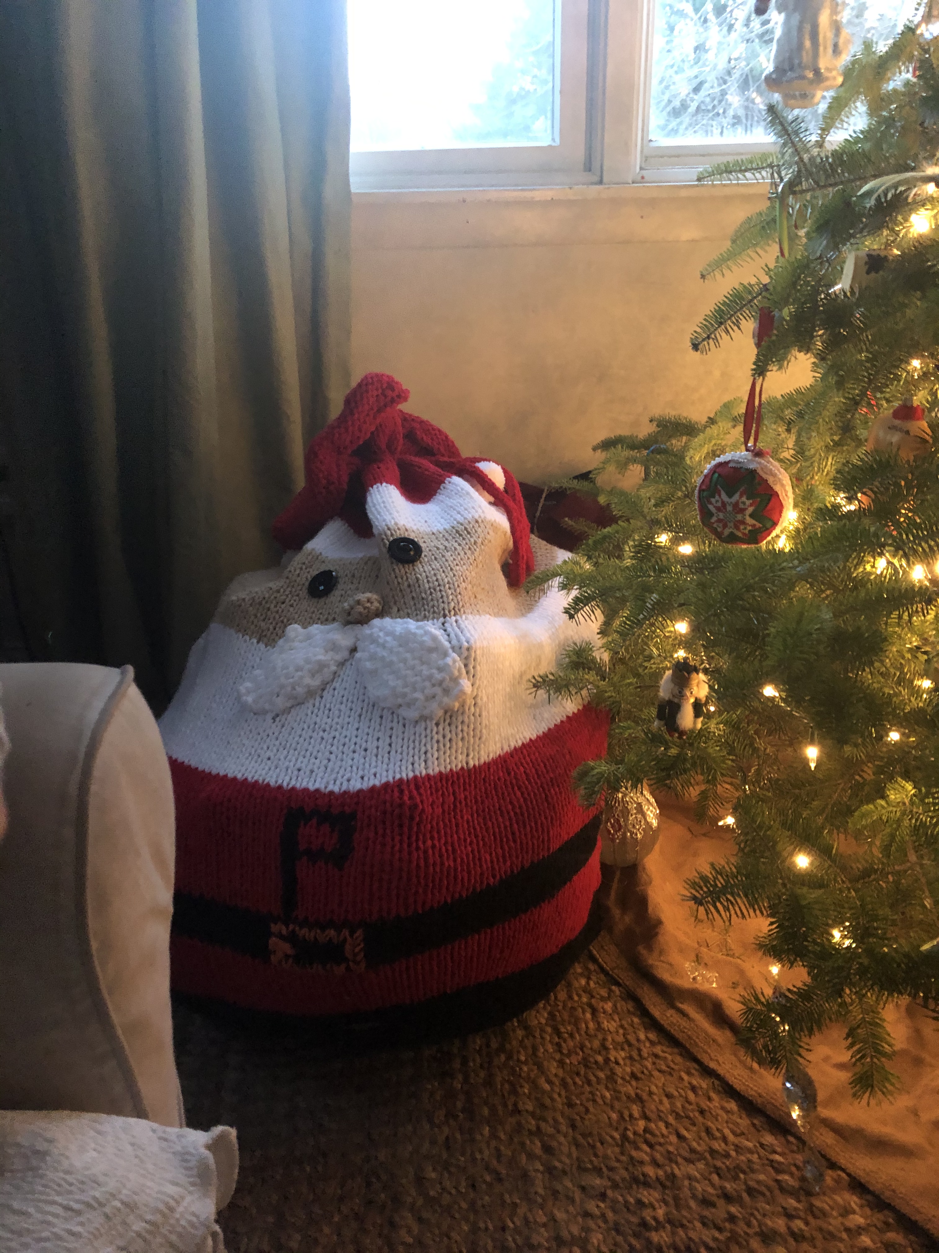 I highly recommend sleigh bags, if you aren’t a wrapper and want to save the moolah or even want to do both like I do, because these hold and hide gifts in between and can easily be carried out to under the tree. My mom knitted one for our family and I have another store bought one for guests that stays under the tree.