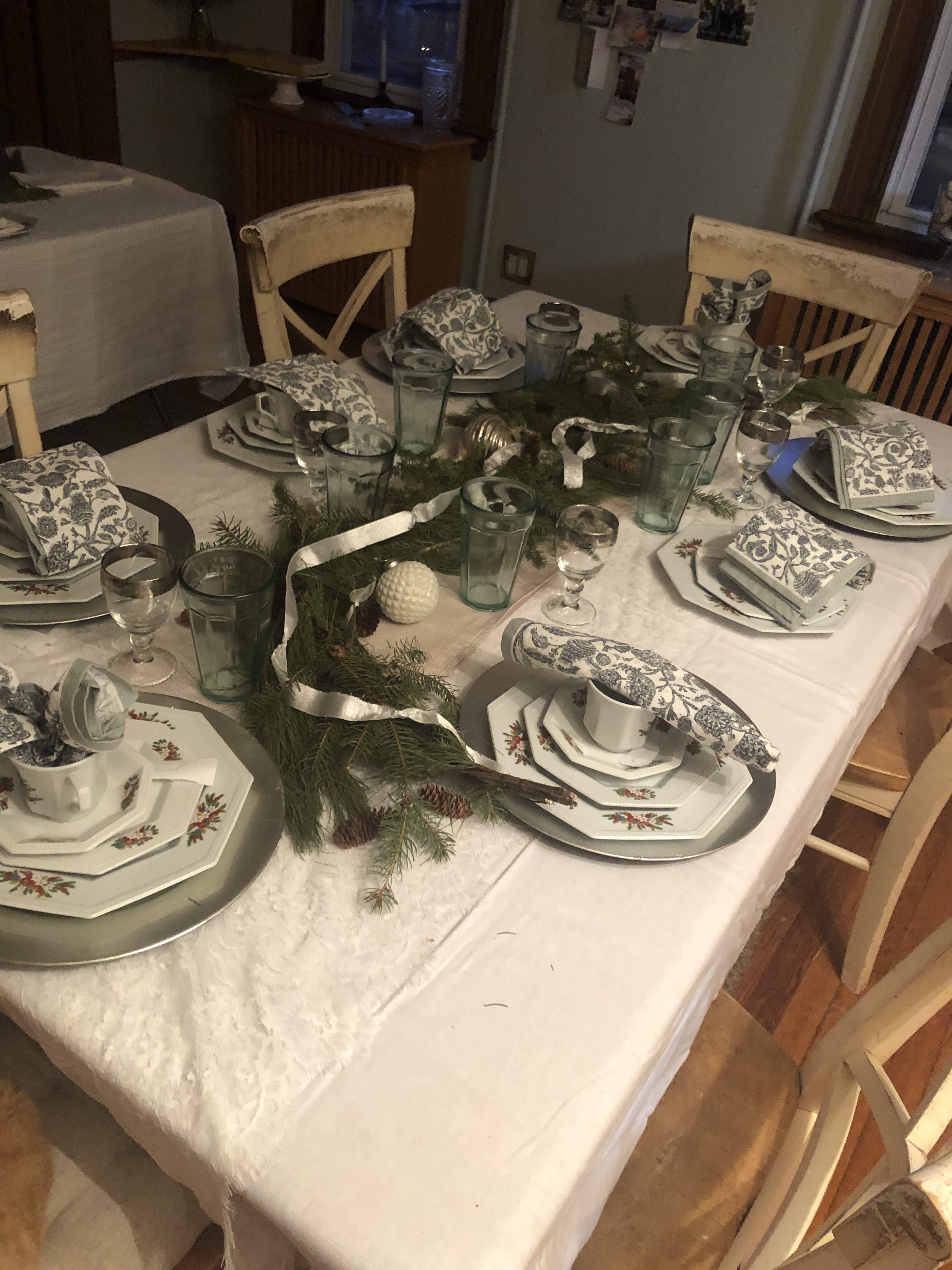 I set my table almost a week before and experiment with it but if you haven’t already done that, do that NOW. For me today, I’m just dusting it and polishing the tableware. But you could also do morning of if you can relax and enjoy it. For me the table is art and so I don’t like to rush. STILL playing with napkins 🥰