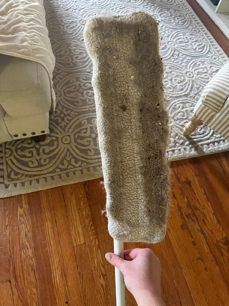 3) It’s a good in-between for when floors are more dusty than dirty or for clinging to dust bunnies or pet hair and even when there is large debris like in front of my fire place that you don’t want to clog up your vacuum or take up space in the small bags. In places like high functioning kitchens, classrooms, craft rooms, hair salons, or homeschool dining rooms where you would need to pull out a vacuum MULTIPLE times in a day, grabbing the sweep mop is faster, and with less effort and inevitably costing less. If you have long haired pets and have to vacuum daily to multiple times a day also-you can save a LOT of energy time and money on bags using this easy hack.