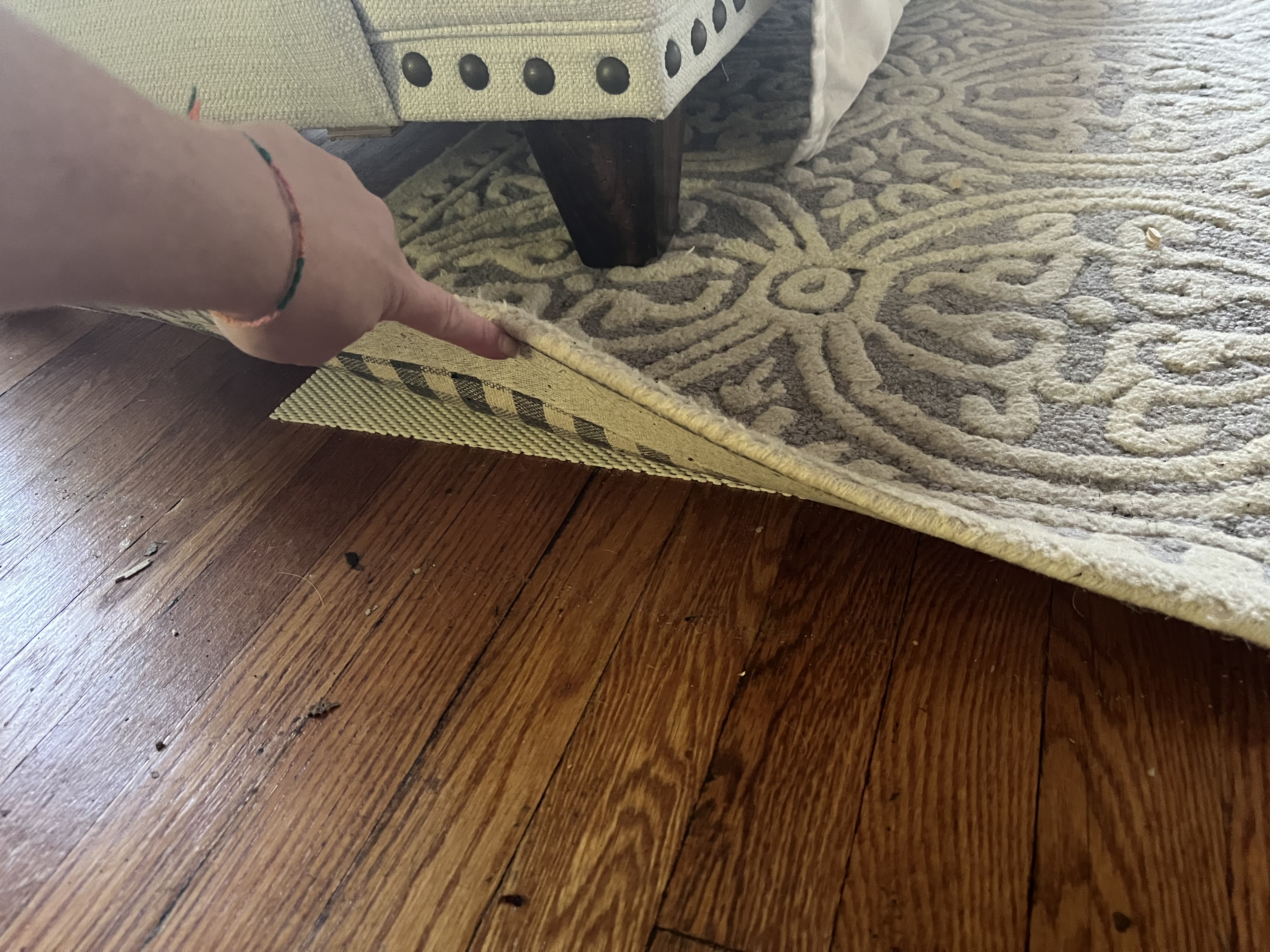 Each time you sweep mop or vacuum just make it a practice of sticking the side of your vacuum head or mop head halfway under the rug to as you go around it’s perimeter. This keeps debris from collecting and staying which over time scratches and warps your flooring.