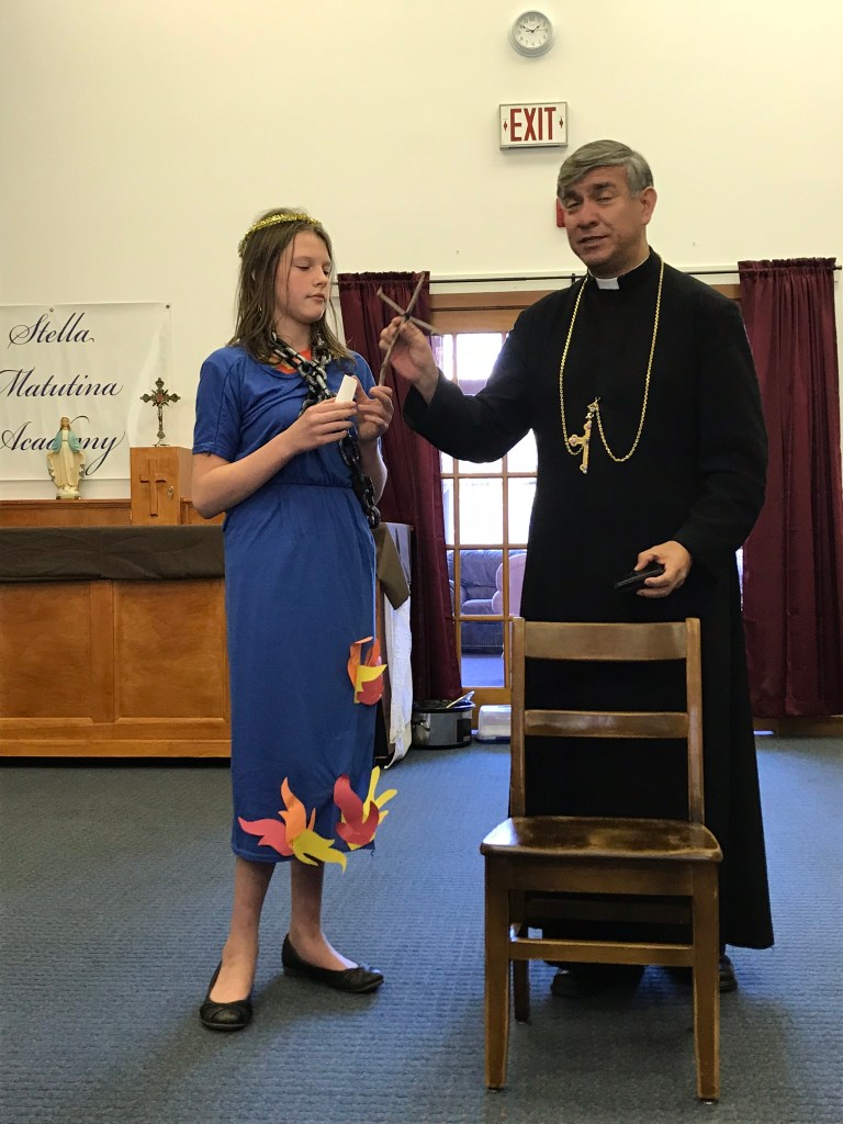 This year my youngest son was Saint Ignatius of Antioch who was forced to apostatize or be thrown to the lions said, “I am the wheat of the Lord, let me be ground by the teeth of beasts into pure bread of Christ. He died in 107AD after writing 7 letter to churches in Asia Minor on the way to Rome to die urging them to remain faithful to God and not to try to save him. He was passionate about church unity and fidelity. St. Ignatius of Antioch, pray for us now.